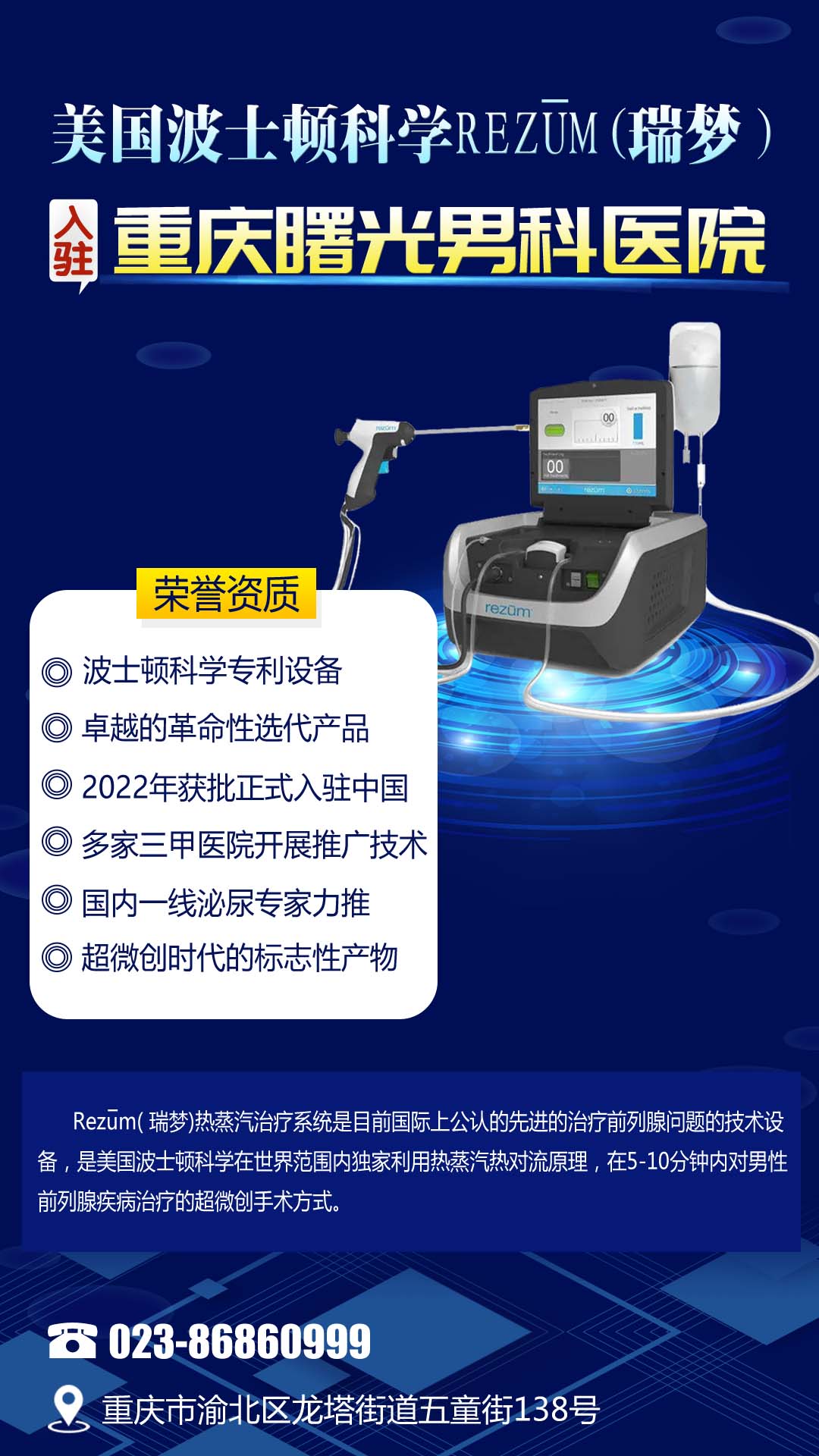 一直以来,前列腺疾病困扰着广大男性,传统的前列腺技术主要是通过电切、等离子、激光剜除等方式,需要全身麻醉。而很多高龄患者伴有多种基础疾病,不能耐受,因此只能依靠保守治疗。重庆曙光男科医院成功引进的美国波士顿科学瑞梦前列腺热蒸汽消融术(Rezūm,又称“瑞梦”)是通过人体尿道伸入进行,患者几乎感受不到疼痛,单次时间仅10分钟左右。由于是超微创技术,不仅时间短,创伤也很小,还可有效减少术后出血和感染,同时破解传统方式可能损伤尿道黏膜的弊端。该技术目前在美国西奈山医院、梅奥医学中心等以及国内几个先进的大医院开展,现首次由重庆曙光男科医院重磅引进落户于重庆,全力解决了重庆男性前列腺患者的病痛折磨。